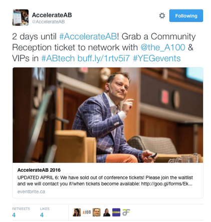 The A100 organizes an annual conference called AccelerateAB. Both the organization and the event have social media accounts and they leverage one another to promote the event.